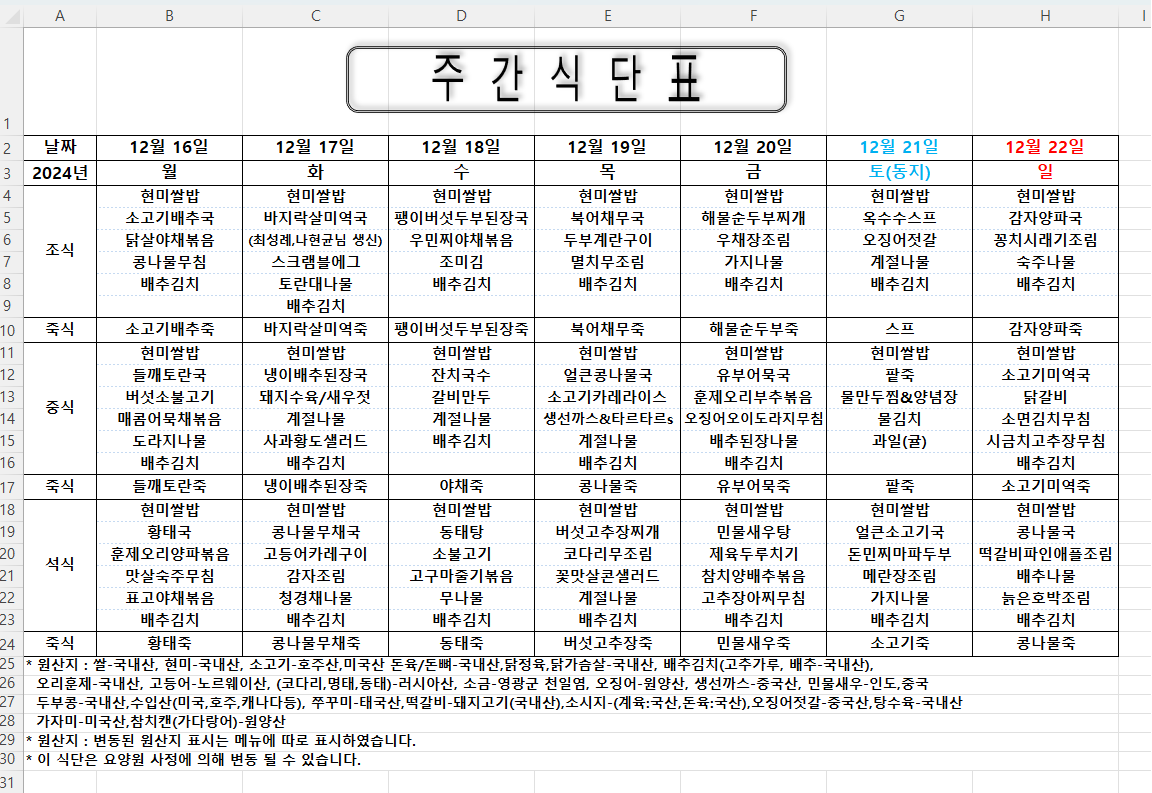 주간식단표 (2024.12.16 ~ 2024.12.22)