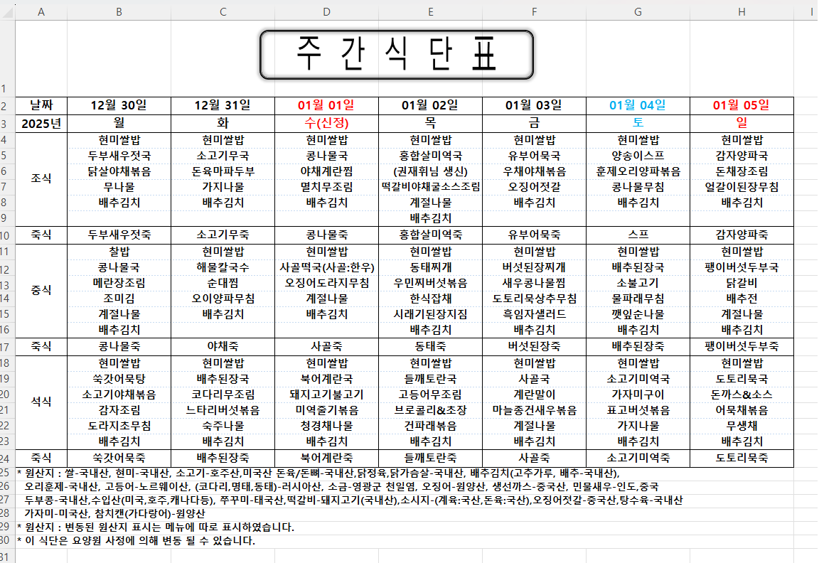 주간식단표 (2024.12.30 ~ 2025.01.05)