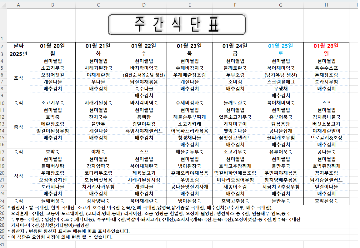 주간식단표 (2025.01.20 ~ 2025.01.26)