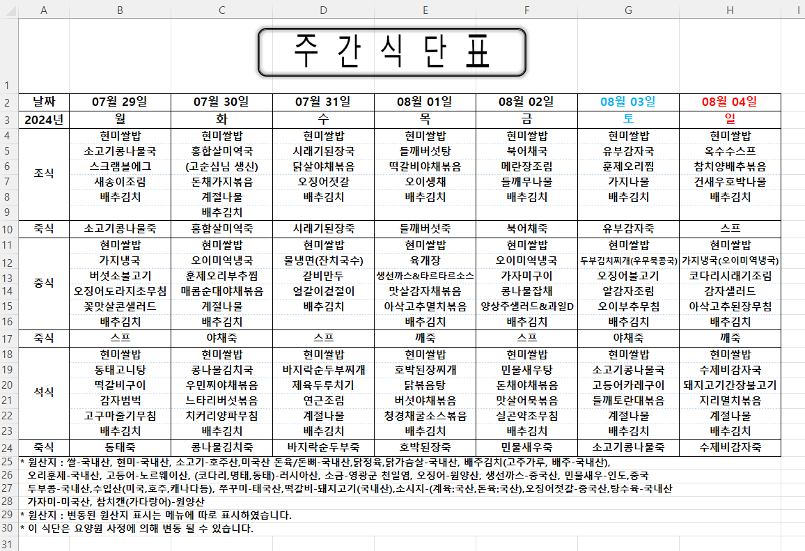 주간식단표 (2024.07.29 ~ 2024.08.04)