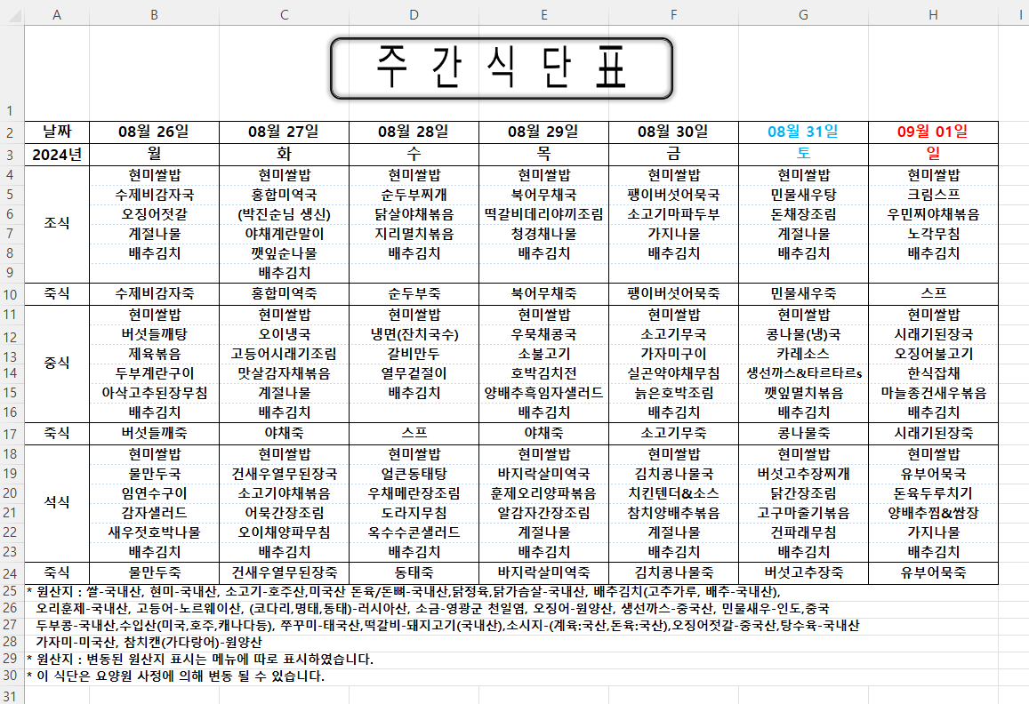 주간식단표 (2024.08.26 ~ 2024.09.01)