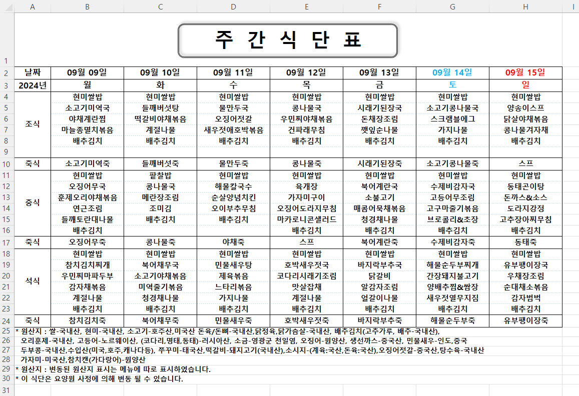 주간식단표 (2024.09.09 ~ 2024.09.15)