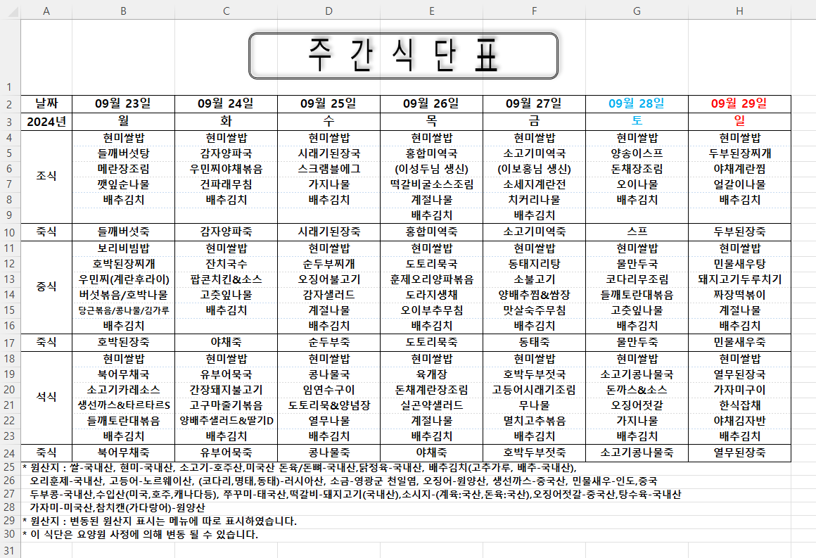 주간식단표 (2024.09.23 ~ 2024.09.29)
