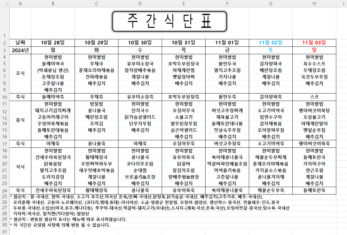 주간식단표 (2024.10.28 ~ 2024.11.03)