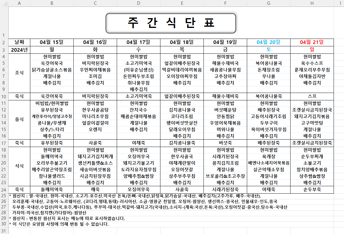 주간식단표 (2024.04.15 ~ 2024.04.21)