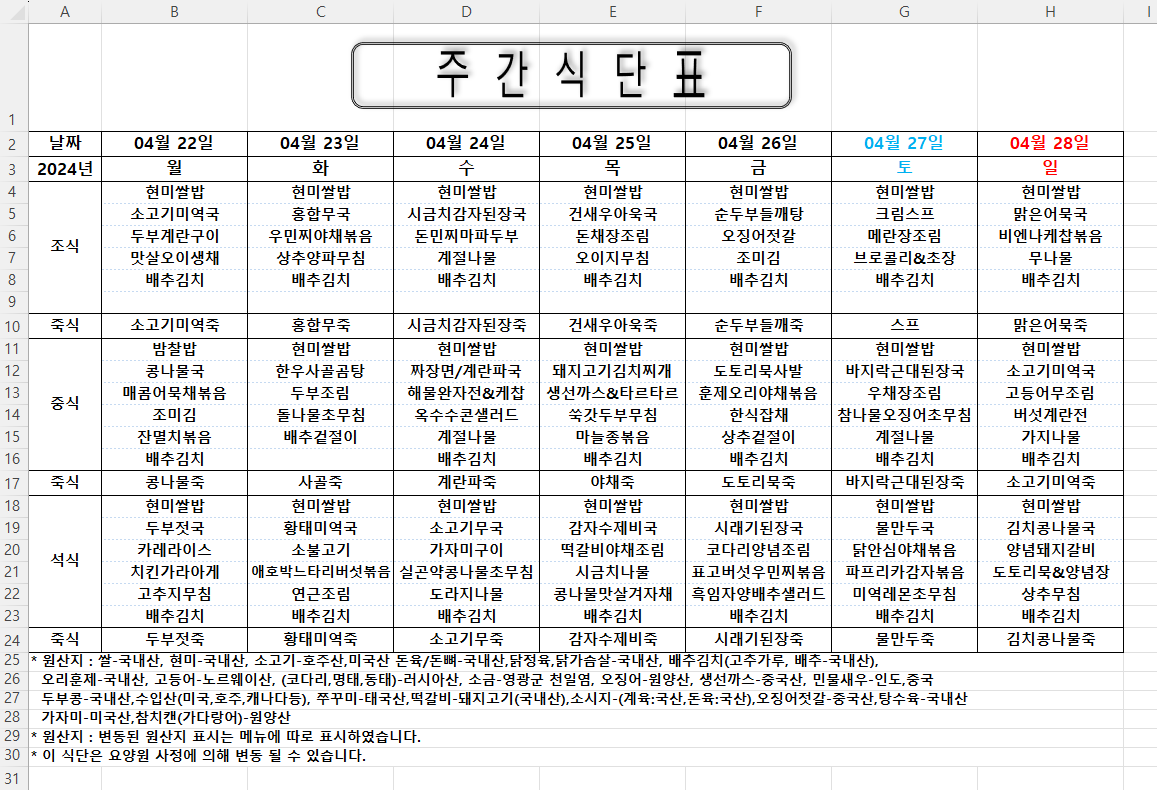 주간식단표 (2024.04.22 ~ 2024.04.28)
