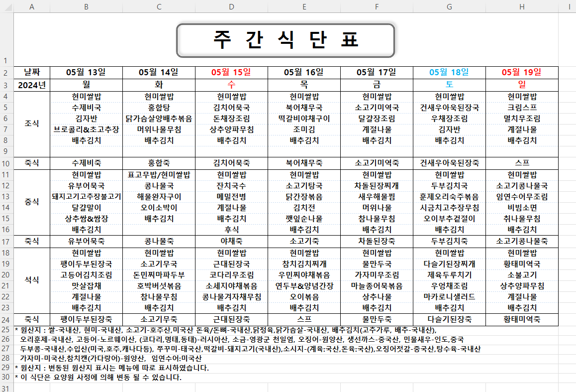 주간식단표 (2024.05.13 ~ 2024.05.19)