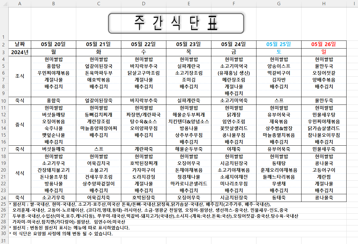 주간식단표 (2024.05.20 ~ 2024.05.26)