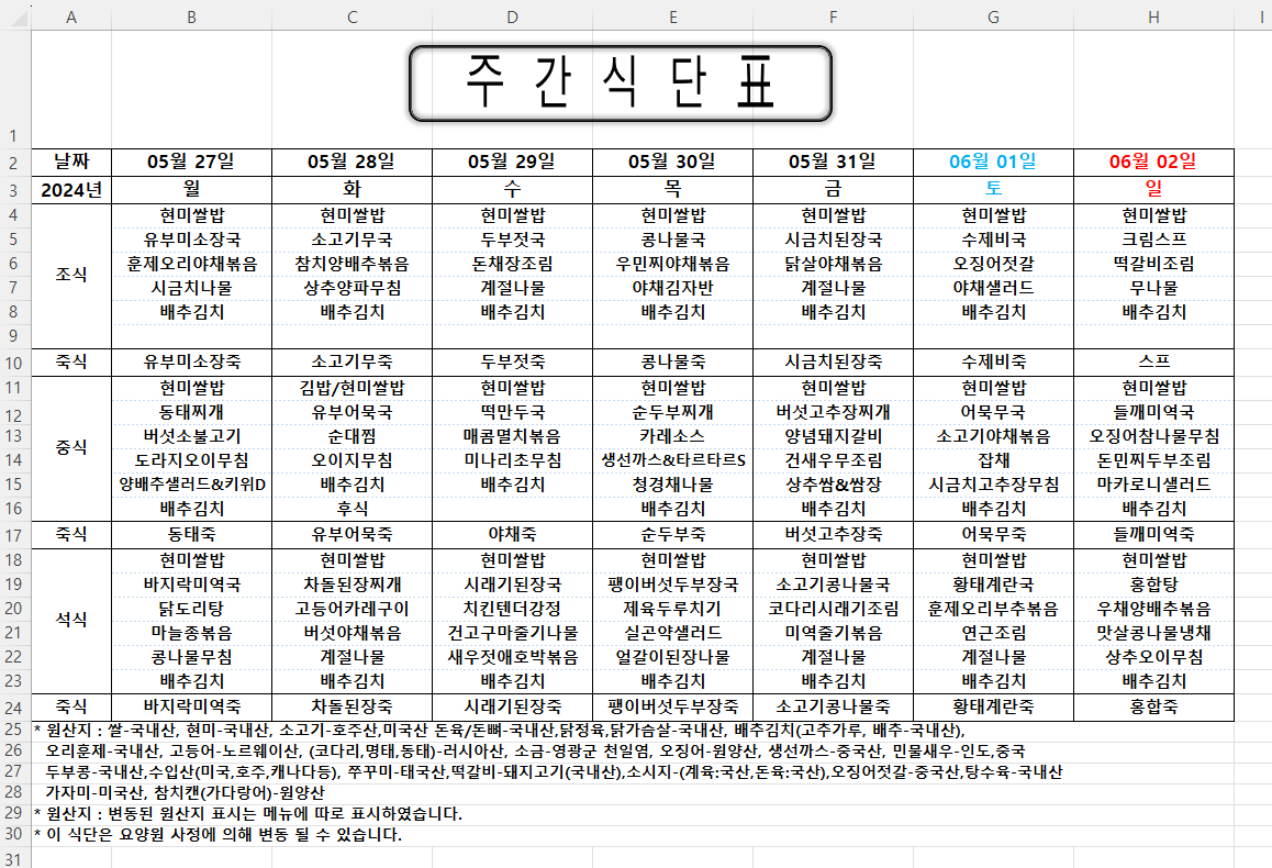 주간식단표 (2024.05.27 ~ 2024.06.02)