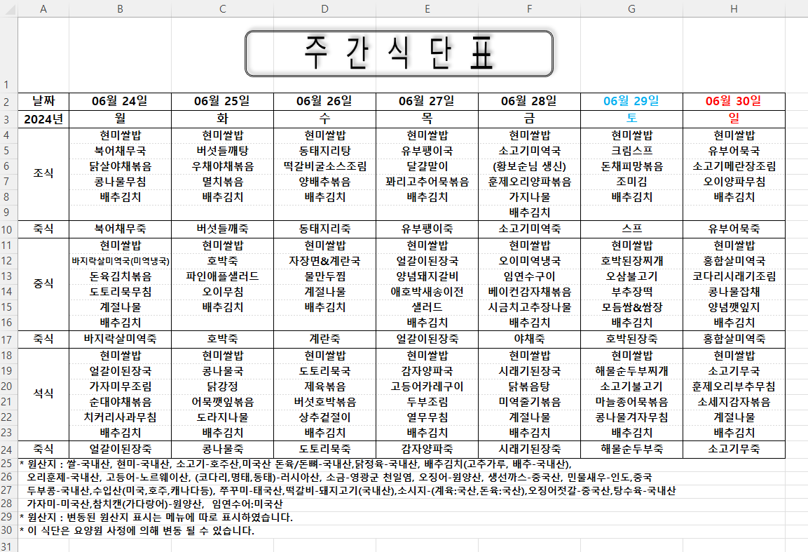 주간식단표 (2024.06.24 ~ 2024.06.30)