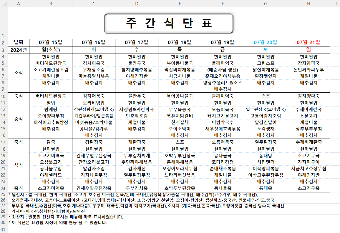 주간식단표 (2024.07.15 ~ 2024.07.21)