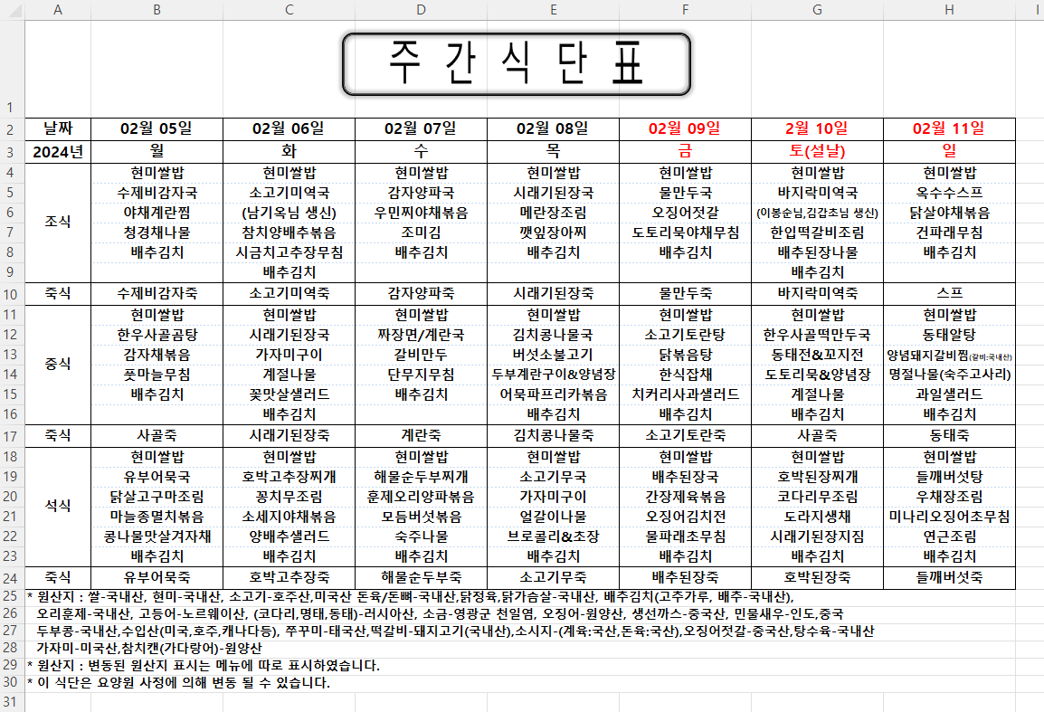 주간식단표 (2024.02.05 ~ 2024.02.11)