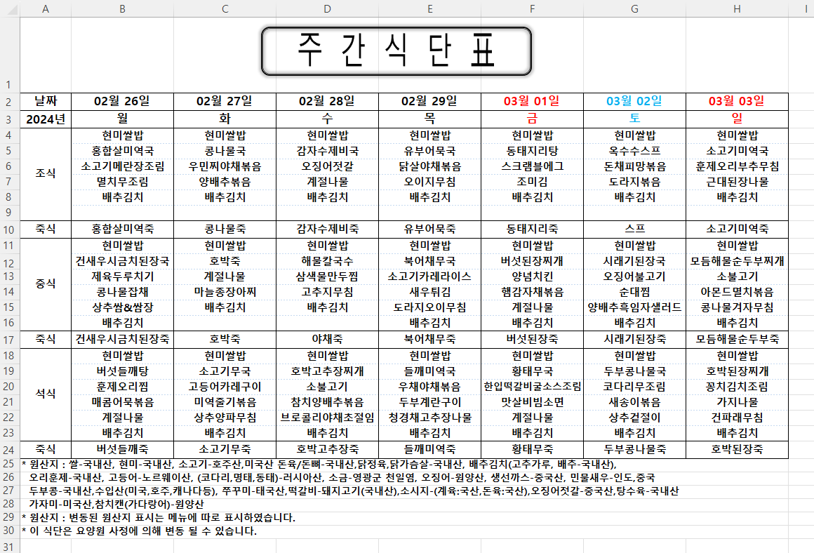 주간식단표 (2024.02.26 ~ 2024.03.03)