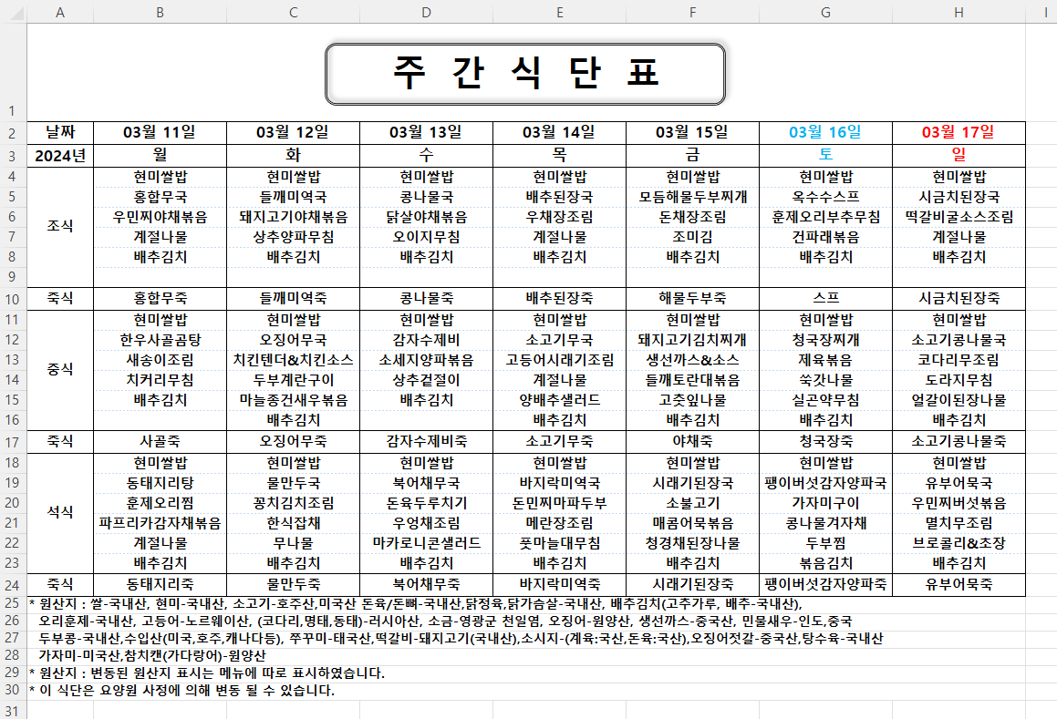 주간식단표 (2024.03.11 ~ 2024.03.17)
