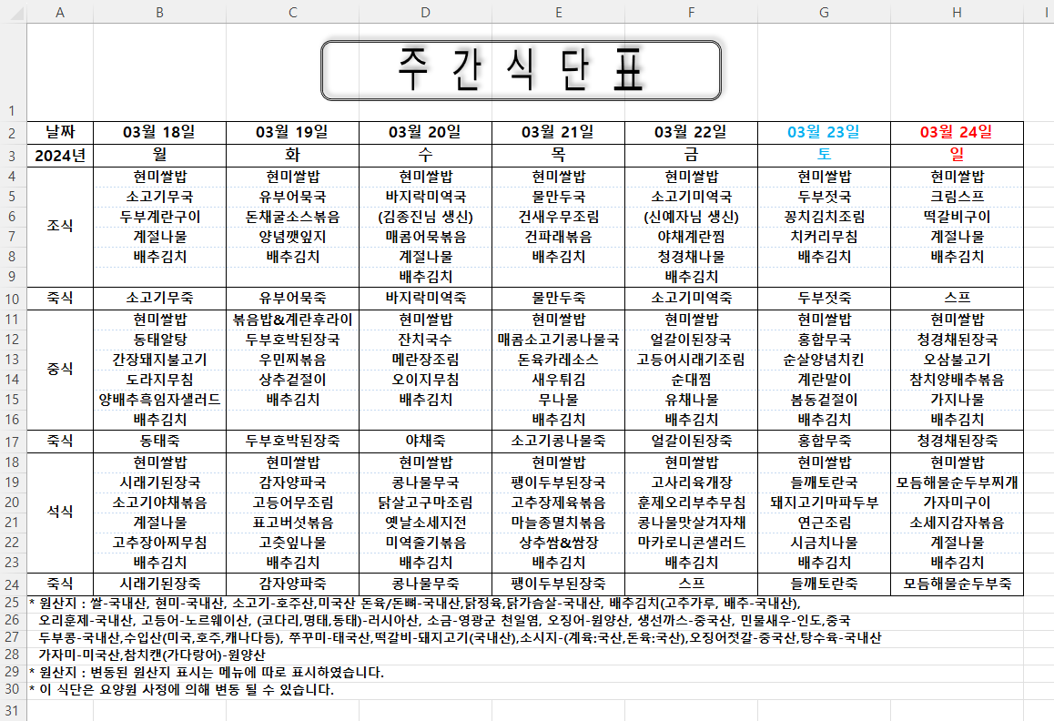 주간식단표 (2024.03.18 ~ 2024.03.24)