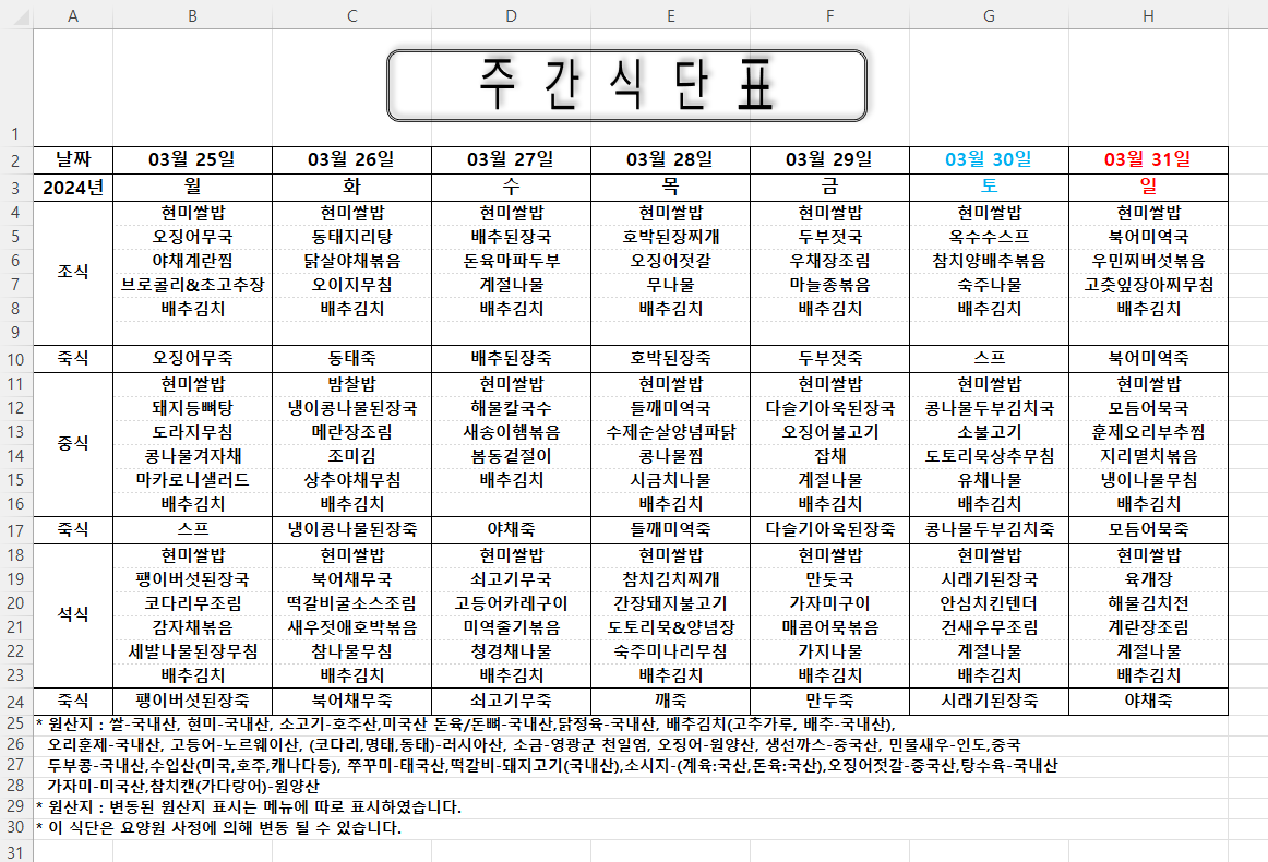 주간식단표 (2024.03.25 ~ 2024.03.31)