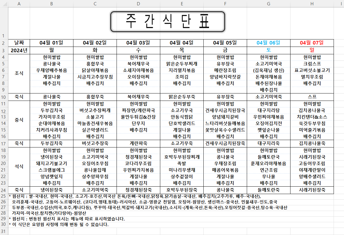 주간식단표 (2024.04.01 ~ 2024.04.07)