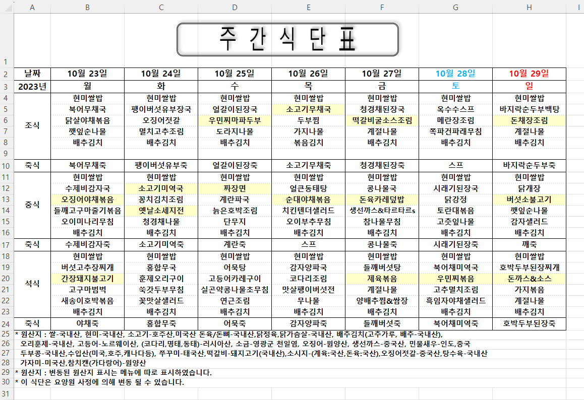 주간식단표 (2023.10.23 ~ 2023.10.29)