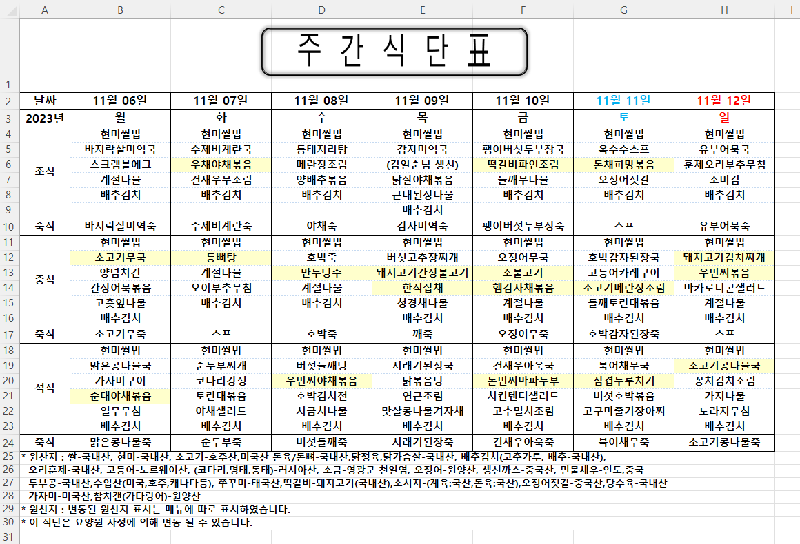 주간식단표 (2023.11.06 ~ 2023.11.12)