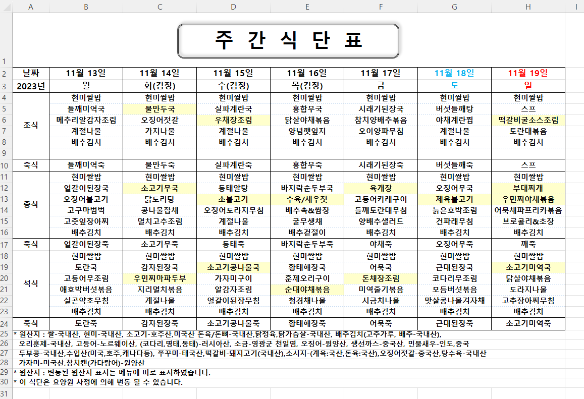 주간식단표 (2023.11.13 ~ 2023.11.19)
