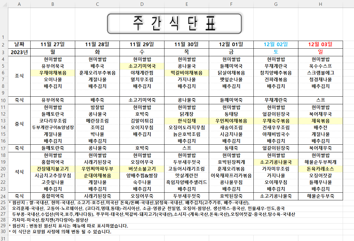 주간식단표 (2023.11.27 ~ 2023.12.03)