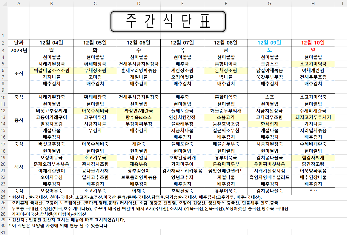 주간식단표 (2023.12.04 ~ 2023.12.10)