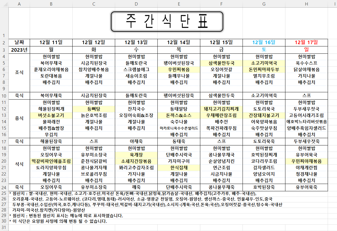 주간식단표 (2023.12.11 ~ 2023.12.17)