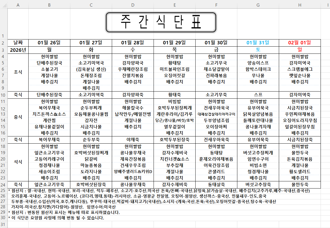주간식단표 (2026.01.26 ~ 2026.02.01)