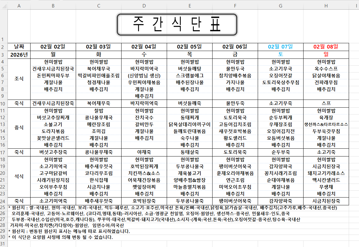 주간식단표 (2026.02.02 ~ 2026.02.08)