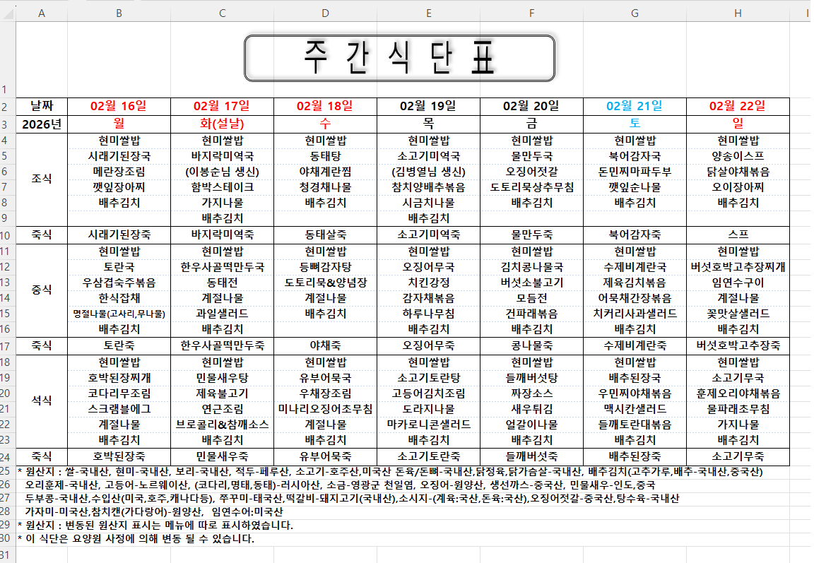 주간식단표 (2026.02.16 ~ 2026.02.22)