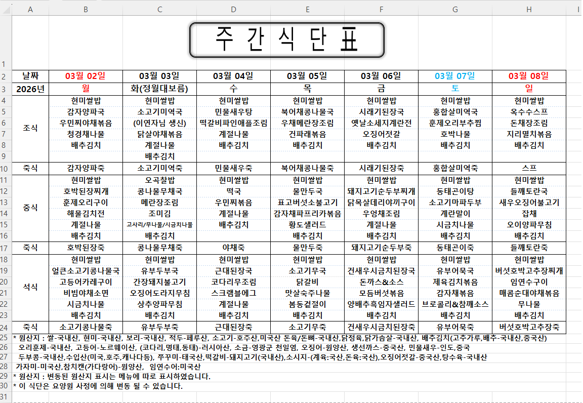 주간식단표 (2026.03.02 ~ 2026.03.08)