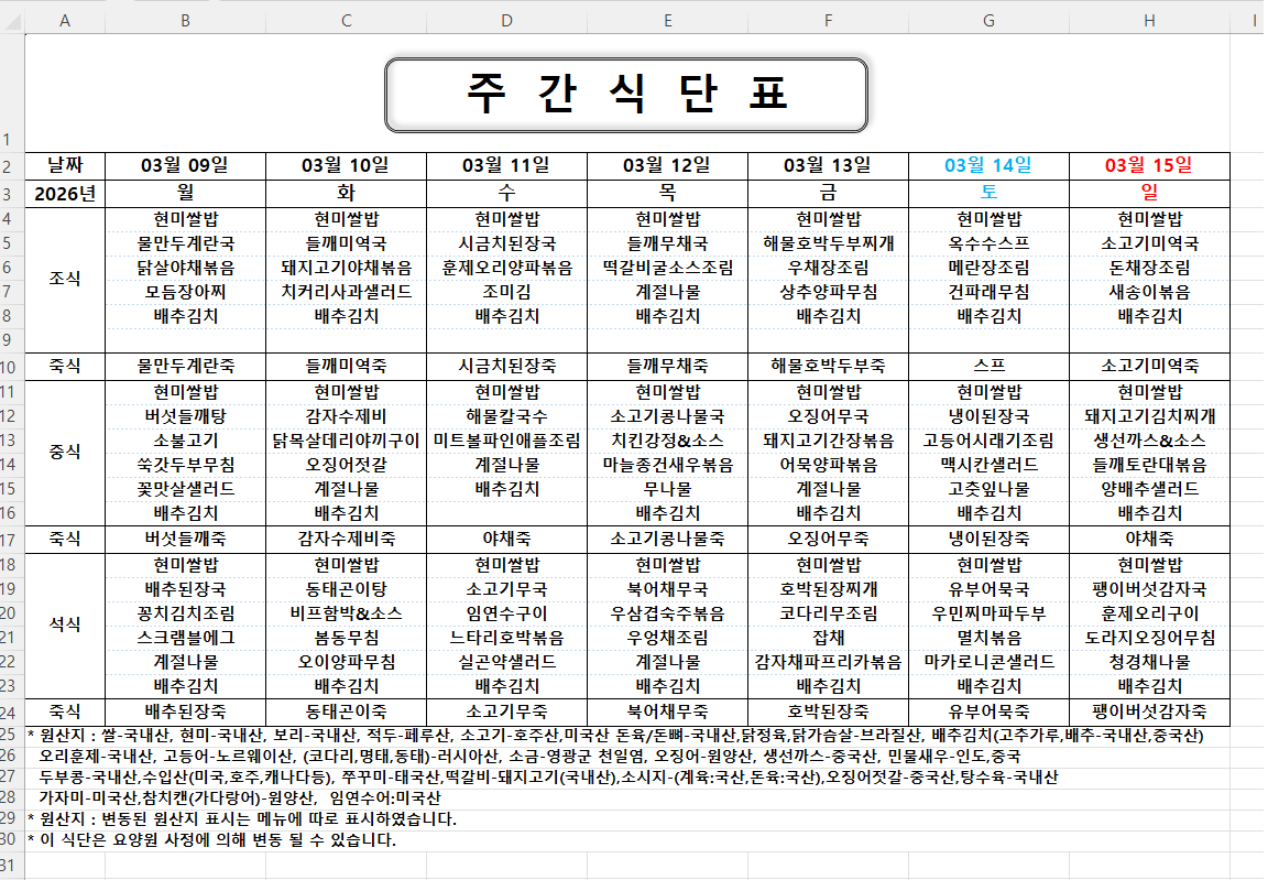 주간식단표 (2026.03.09 ~ 2026.03.15)