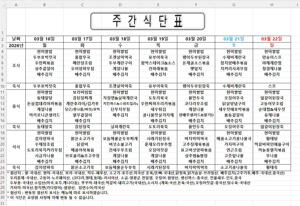 주간식단표 (2026.03.16 ~ 2026.03.22)
