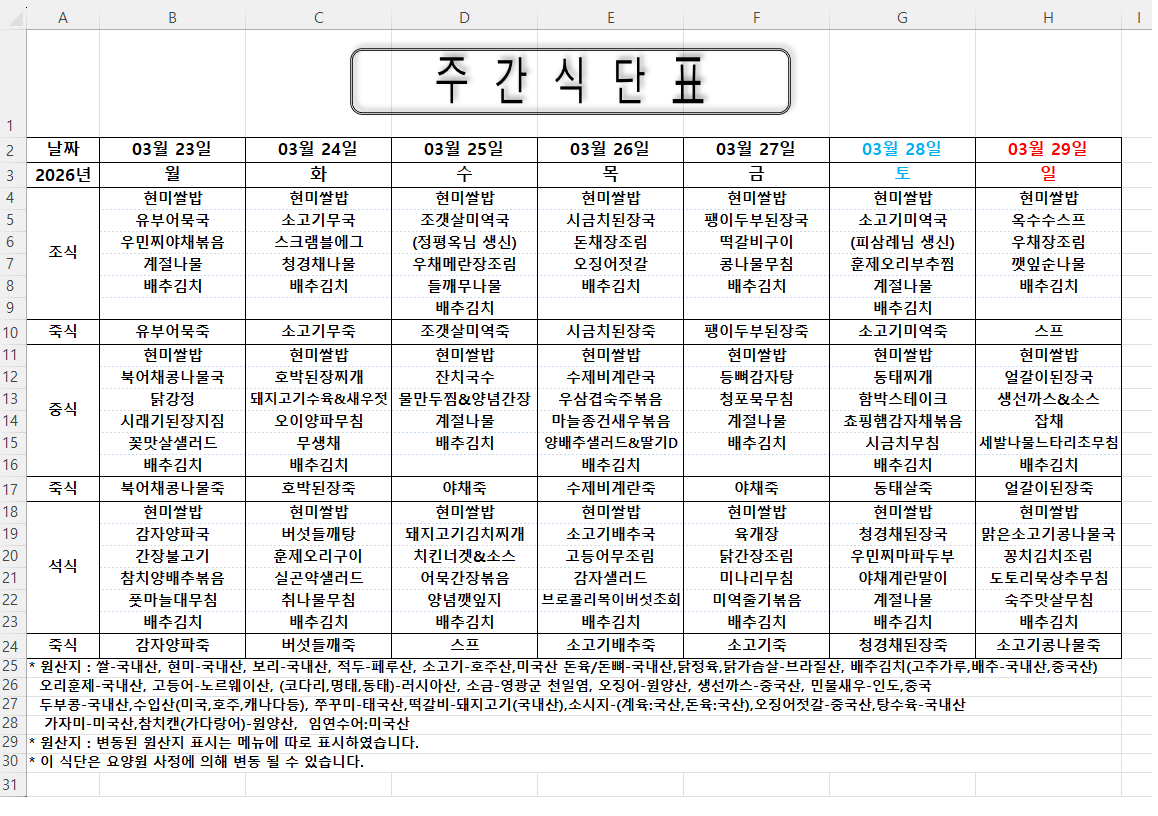 주간식단표 (2026.03.23 ~ 2026.03.29)