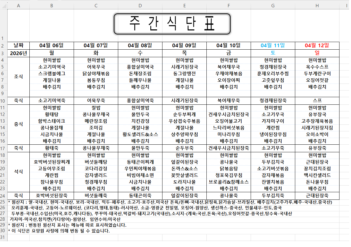 주간식단표 (2026.04.06 ~ 2026.04.12)