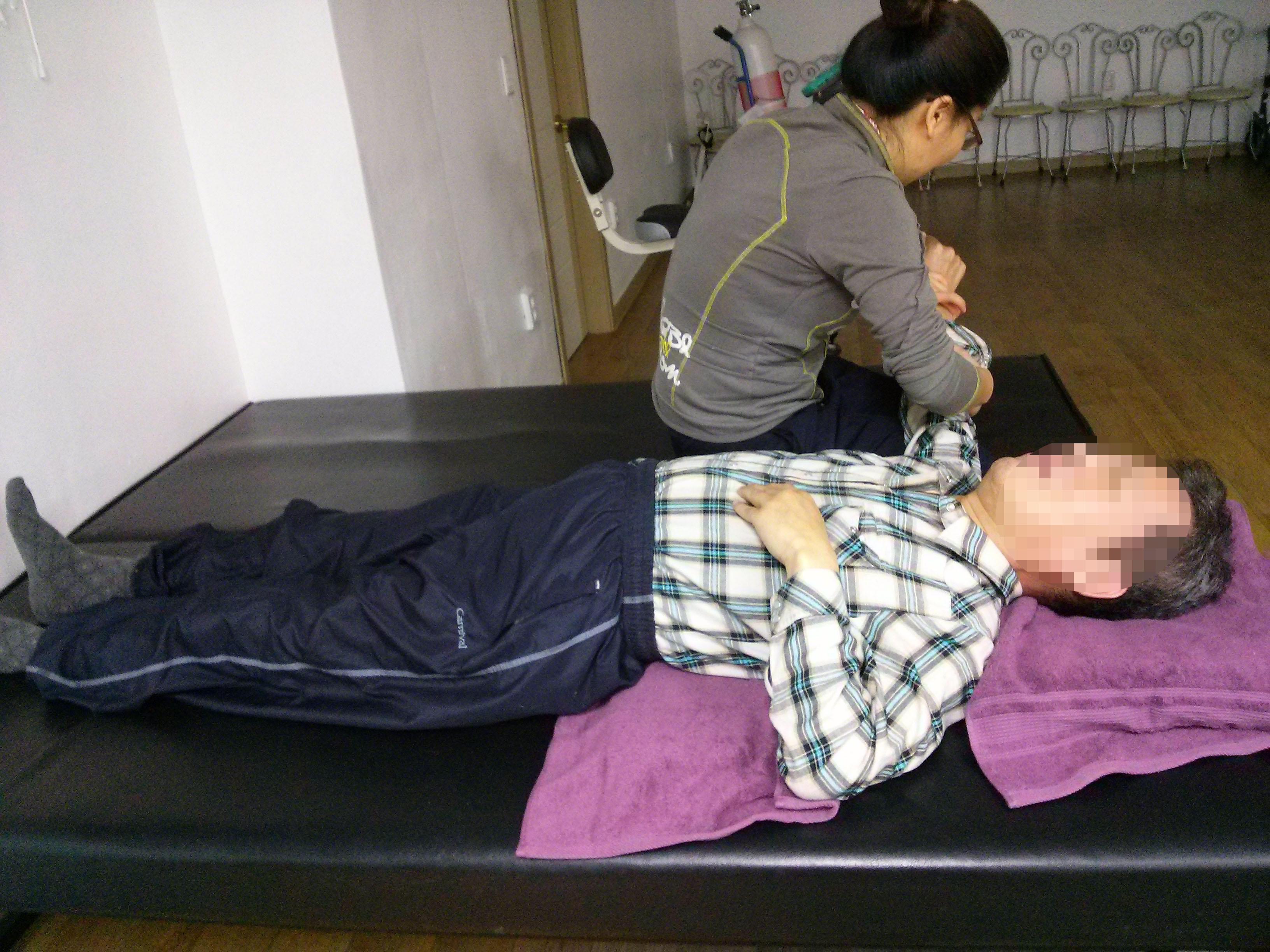 물리치료실에서 작업치료사가 편마비 어르신의 관절가동범위를 넓혀드리는 운동을 도와 드립니다.
