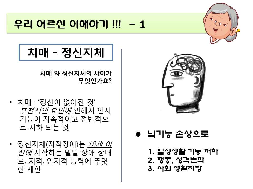 치매 - 라티어로 " 정신이 없어진 것" 정상-> 다양한 요인으로 -> 뇌기능(기억력, 언어능력, 시공간 파악능력, 판단력, 추상적 사고력)손상->인지기능 저하 -> 전반적, 지속적 저하 => 노망, 망령, 나이를 먹으면 당연히 겪는 과정이 아니라 뇌질환임!! => 다양한 원인으로 인한 것이므로 접근법, 치료법이 다양
